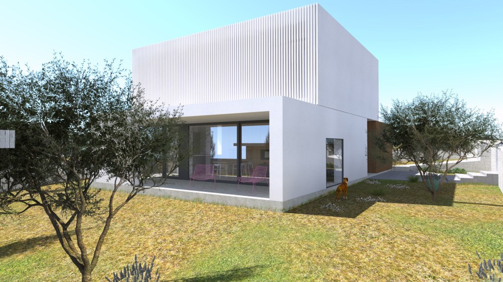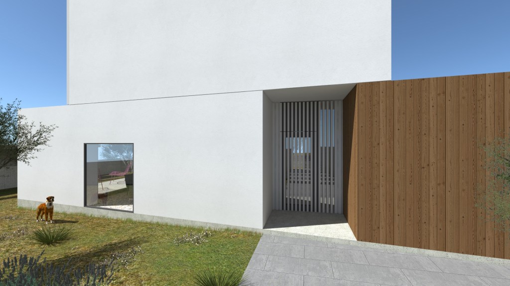 This idea is developed through a volumetric composition shaped in three boxes. Two separated boxes on a ground floor, over which is third box on a first floor.
